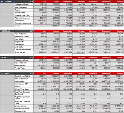 Analytics & Performance Tracking: track metrics across all channels on a monthly basis and use data to refine content strategy and scale what works